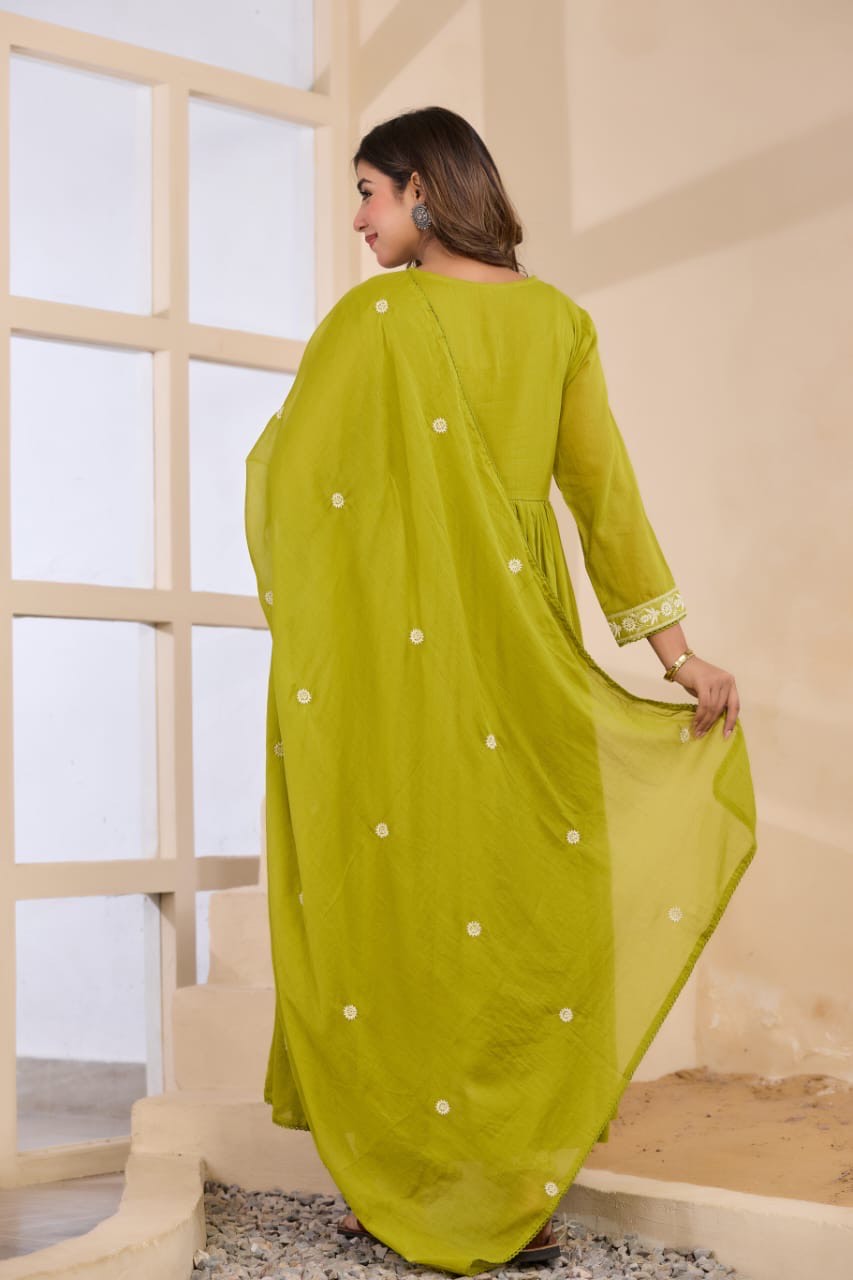 Lime Green Floral Embroidered Straight Kurta With Trouser & Dupatta